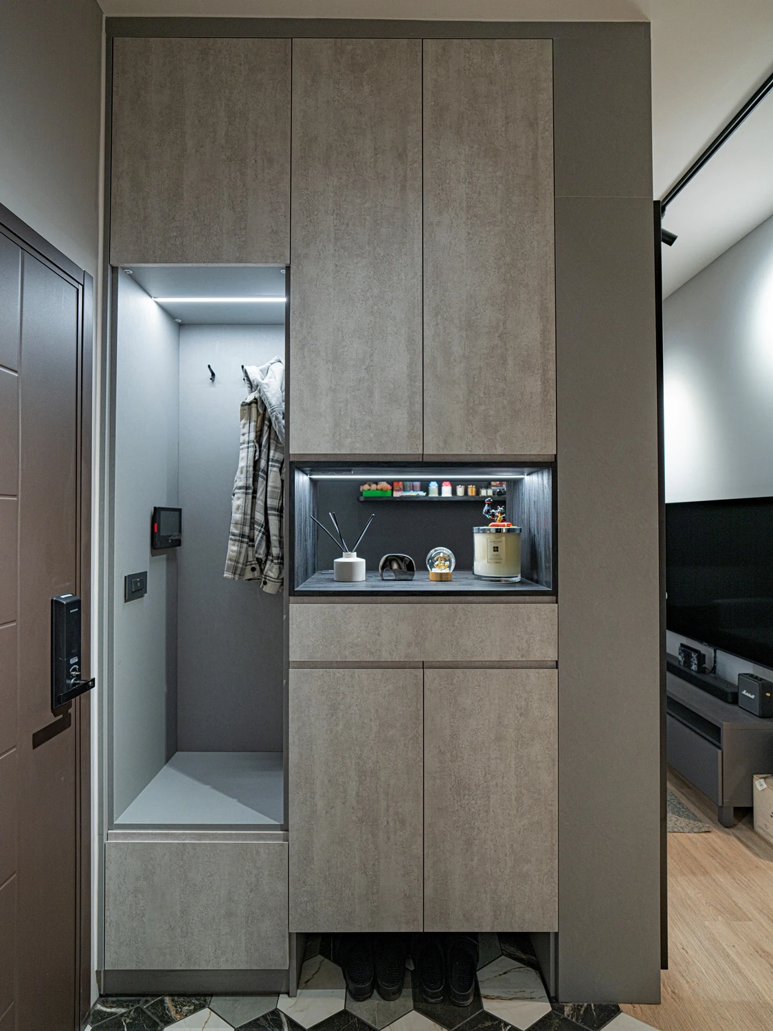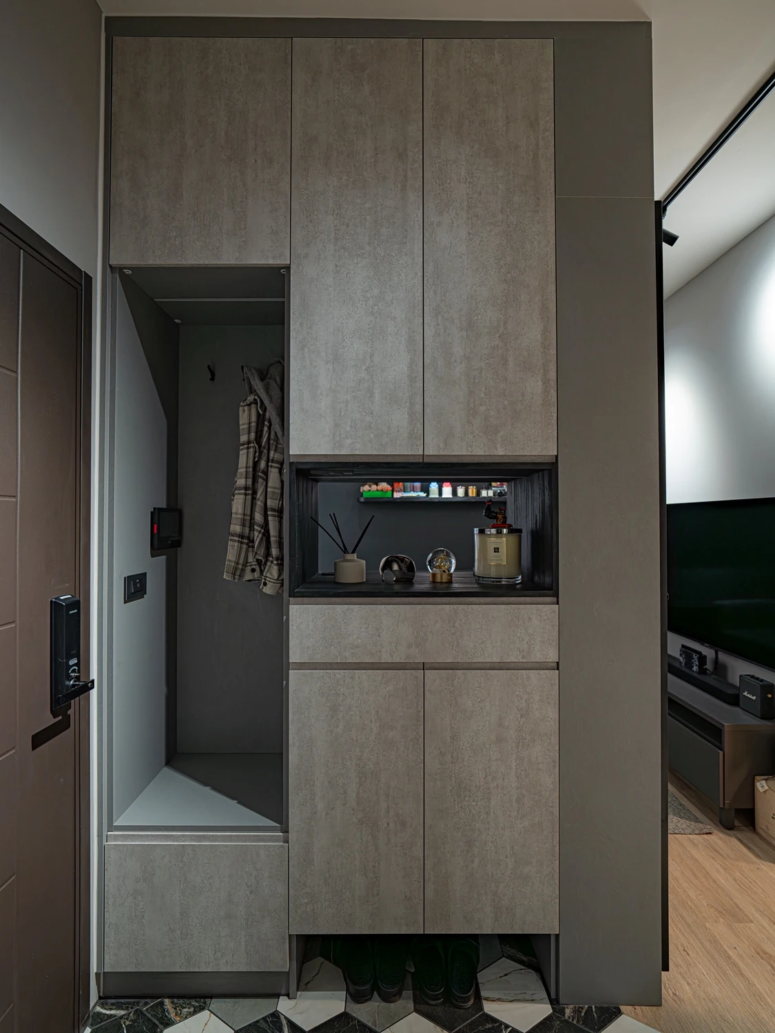 玄關櫃的部分結合了穿鞋椅、矮櫃、汙衣區