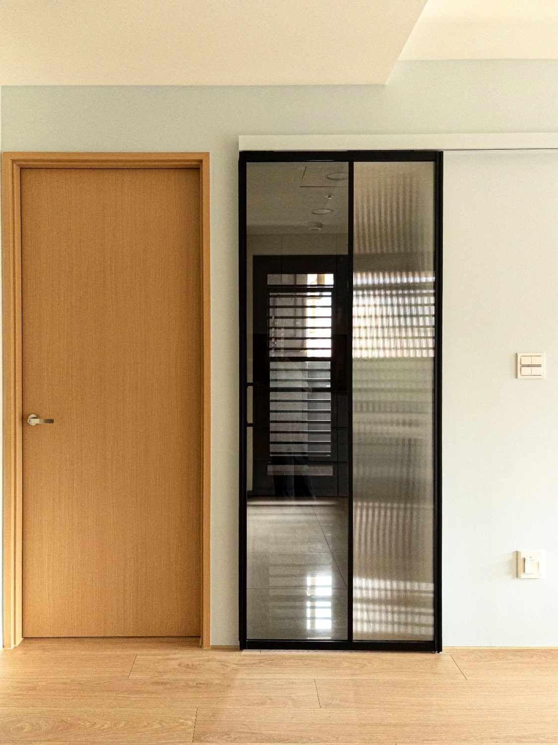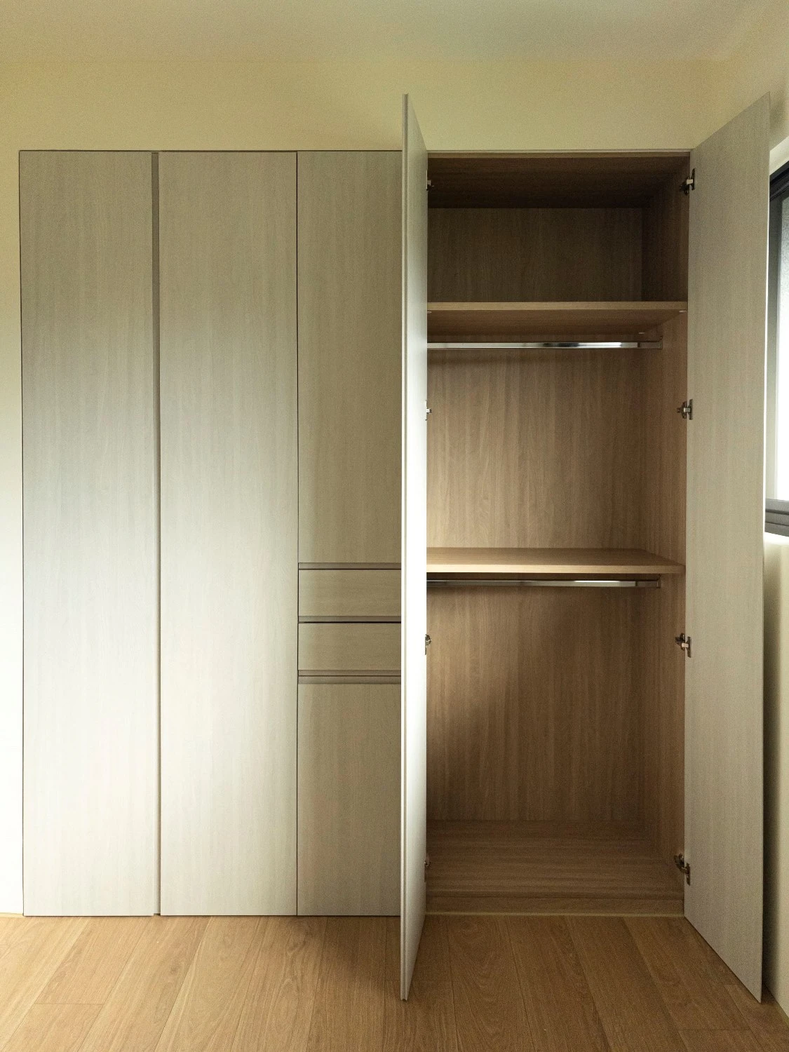 主臥擁有更寬裕的私人生活範圍,將收納空間與牆面融為一體規劃內嵌式櫃體