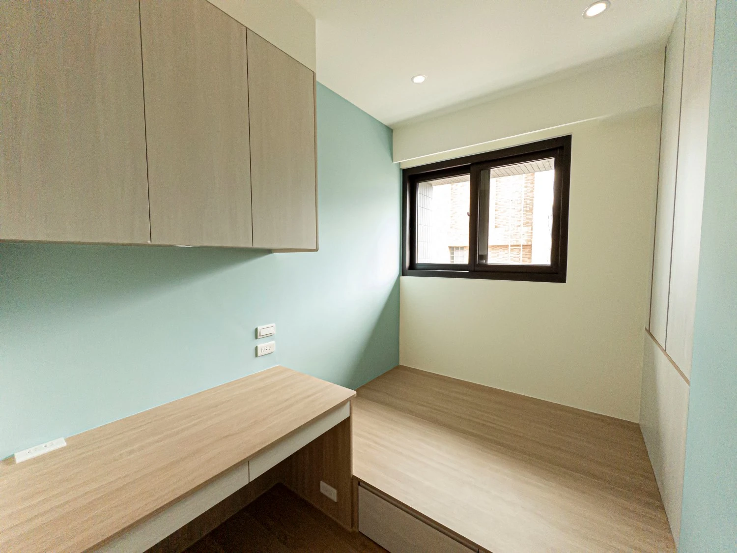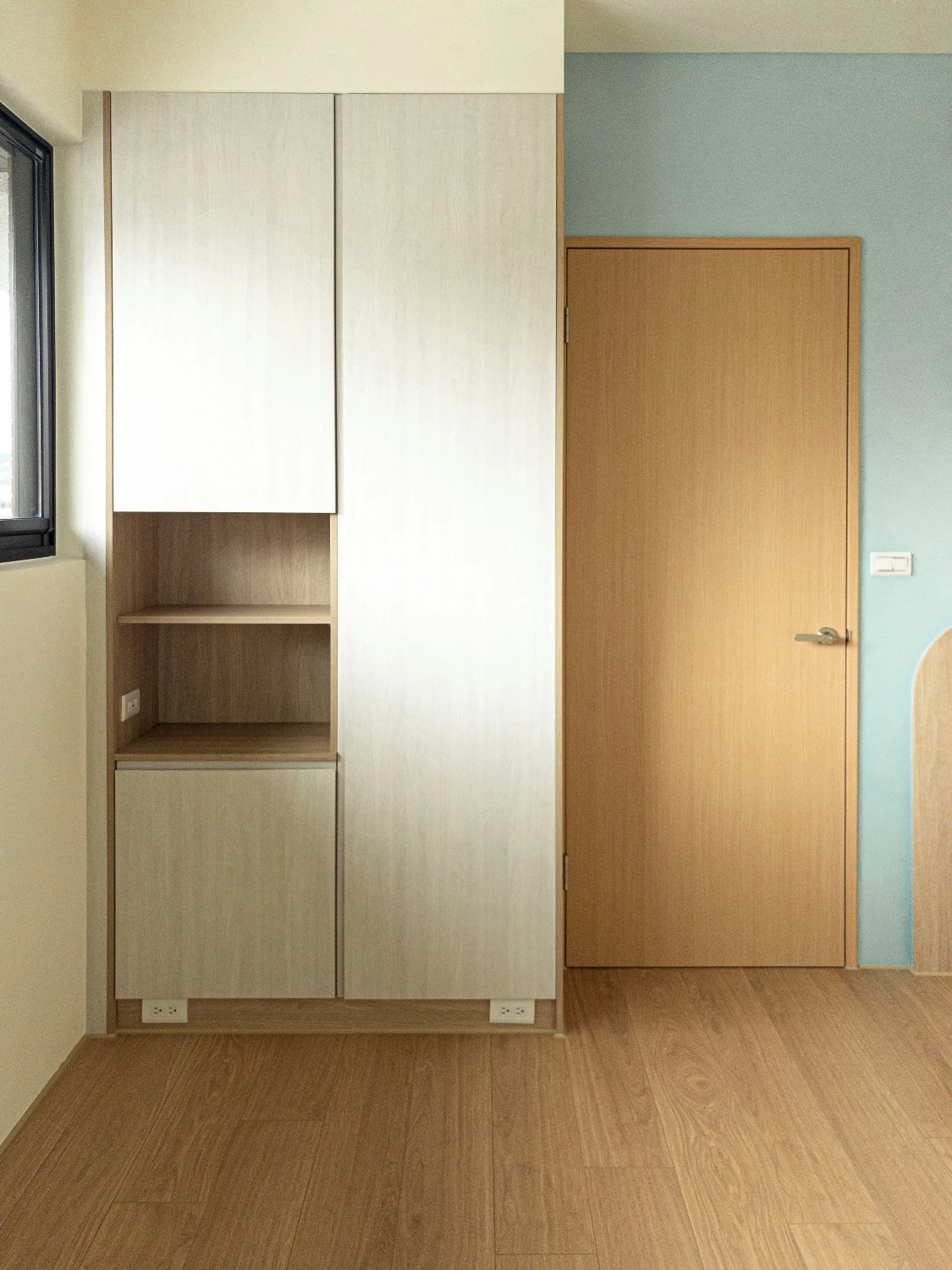 利用白色作為基底,淺木紋與低飽和天空藍主牆,大面積留白營造通透、寬敞的視覺感受