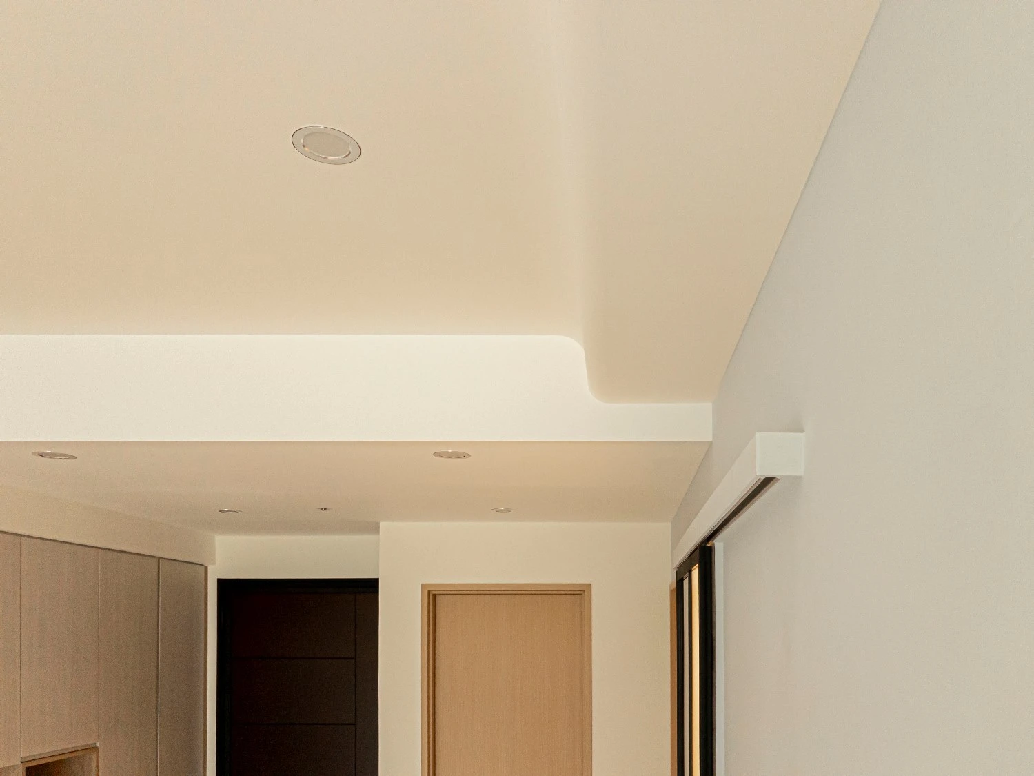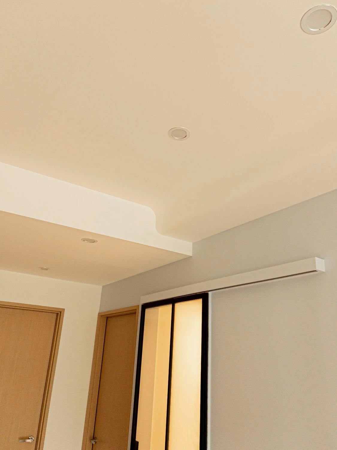 室內的大樑結構,我們以弧型包樑設計延伸至天花板,柔化量體的同時讓視覺向上延展
