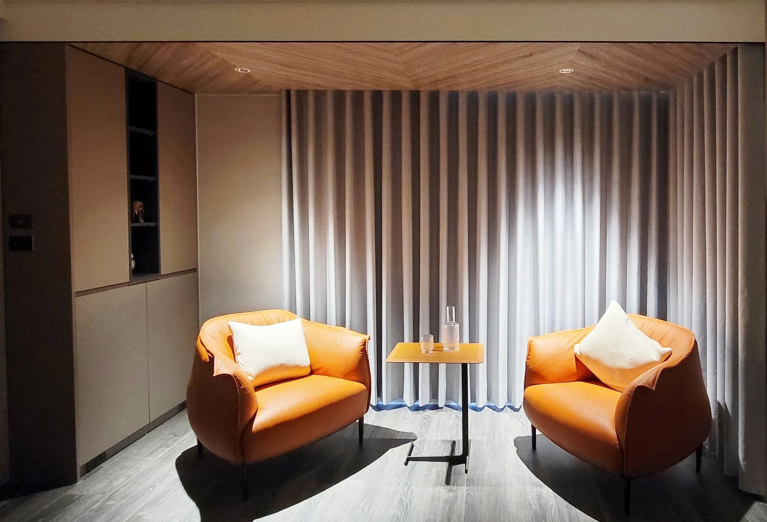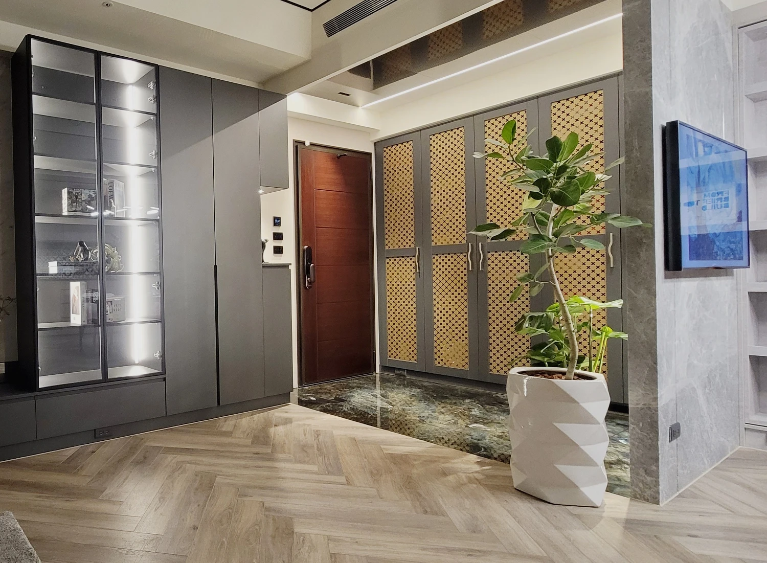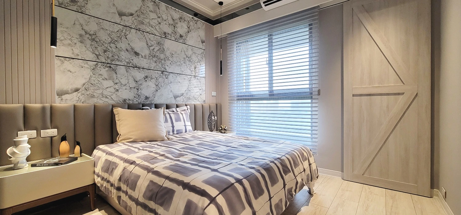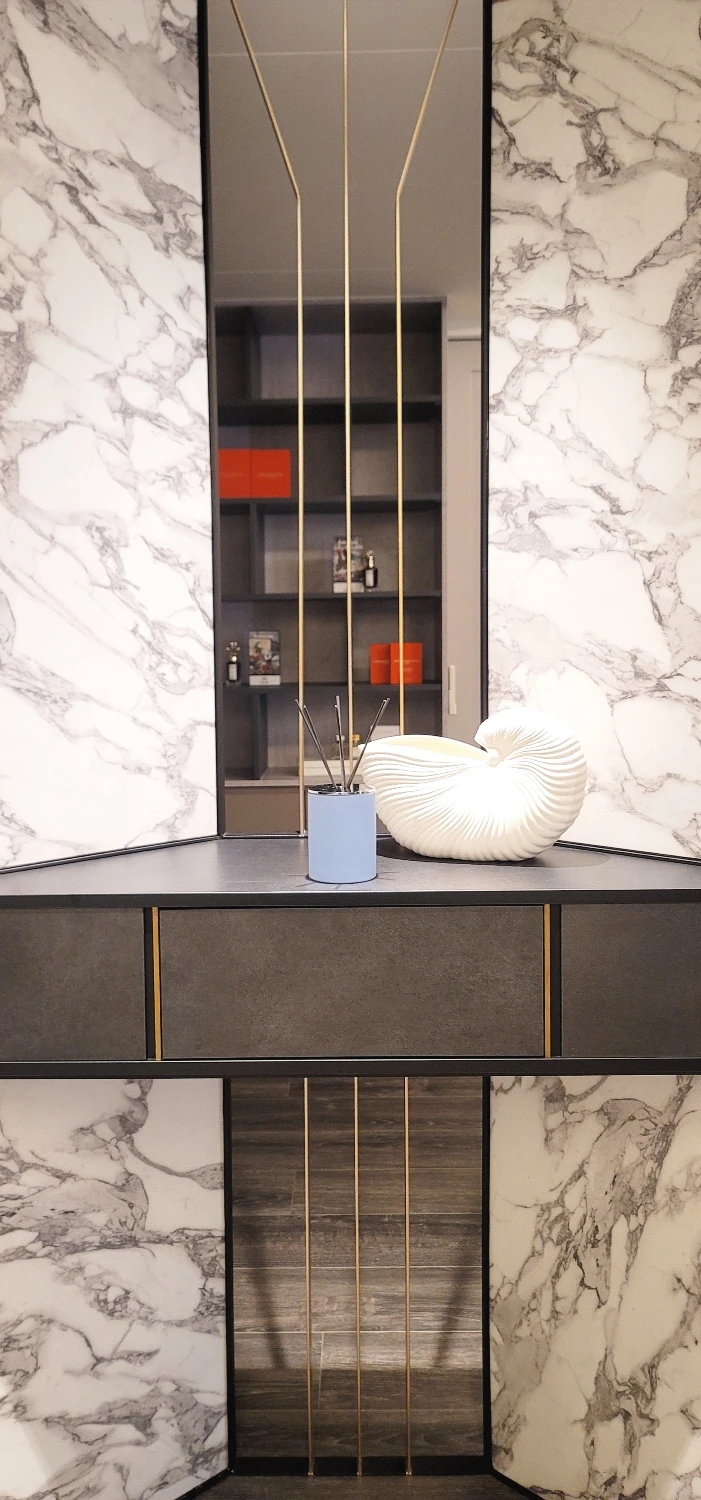信步晃蕩公領域,和煦陽光經由落地窗兀自灑落,營造明敞通透的廣袤空間感,暢享山海環繞、得天獨厚的絕佳地理位置;與此同時,直面機場航道,得時時飽覽飛機起降的獨特景致。細節處緊扣親子宅的概念初衷,譬如玄關開闊的迎賓區即專為兩台嬰兒車量身打造,強調進門處的收納、置物等方便性。色彩計畫部分,援引沉穩、內斂的中性色調織就,亦反映出男主人對於大理石材格外講究並情有獨鍾,像是玄關地坪的百達翡麗、屏風的安地斯灰網石、客廳的小雕刻白大理石……等等,憑藉璀璨靈巧的別緻紋理篆刻低奢語彙,譜寫氣宇軒昂的現代風尚宅邸群像。