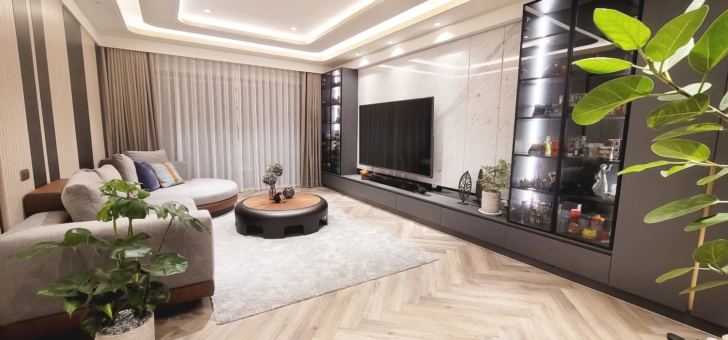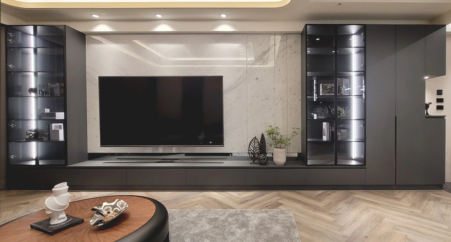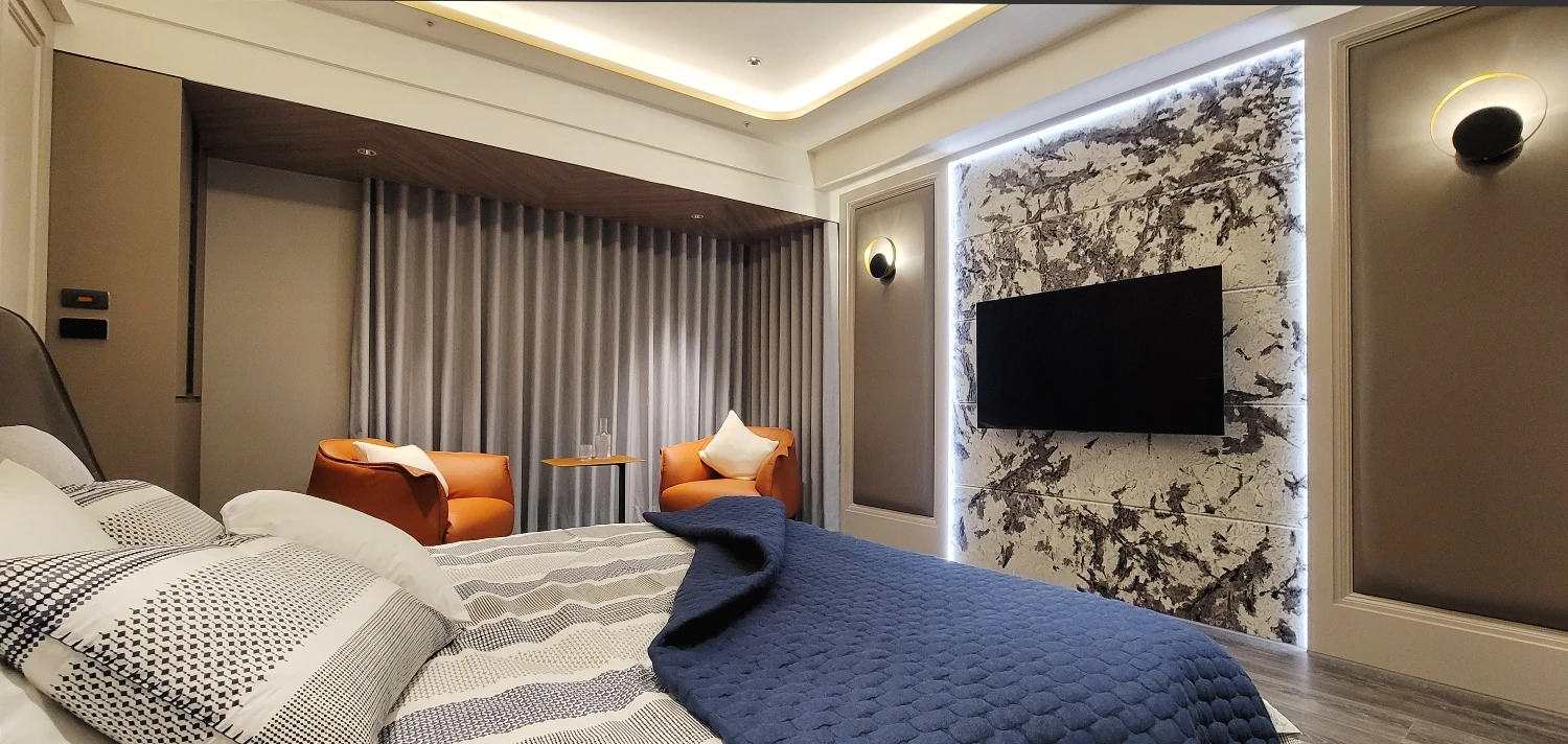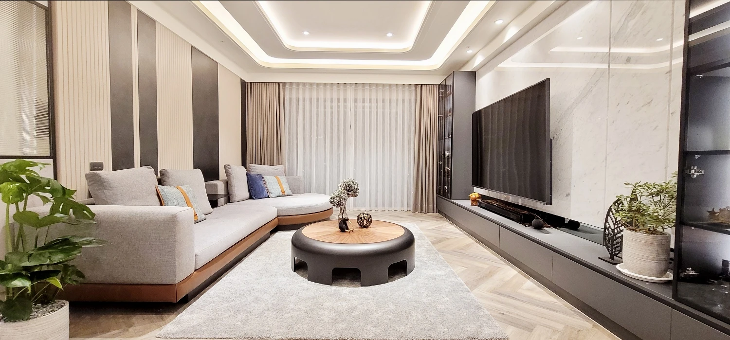 親子宅給人的刻板印象總跳脫不了自然樸實、溫馨舒適等關鍵字,然而本案男主人嚮往的理想家居則冀盼徜徉輕奢氛圍,極喀室內裝修設計遂巧借異材質拼貼疊砌瑰麗層次,勾勒卓爾不凡的魅力之境。此外,考量整體坪數較大、各項電器設備的開關距離拉得較遠,全屋悉心搭載智能科技,多數動作皆能透過聲控完成指令,使女主人在育兒、家務方面更加得心應手,竭力滿足每位家庭成員需求,演繹自在自適、同享天倫之樂的生活場域,領略富足、自由的心靈沉澱。