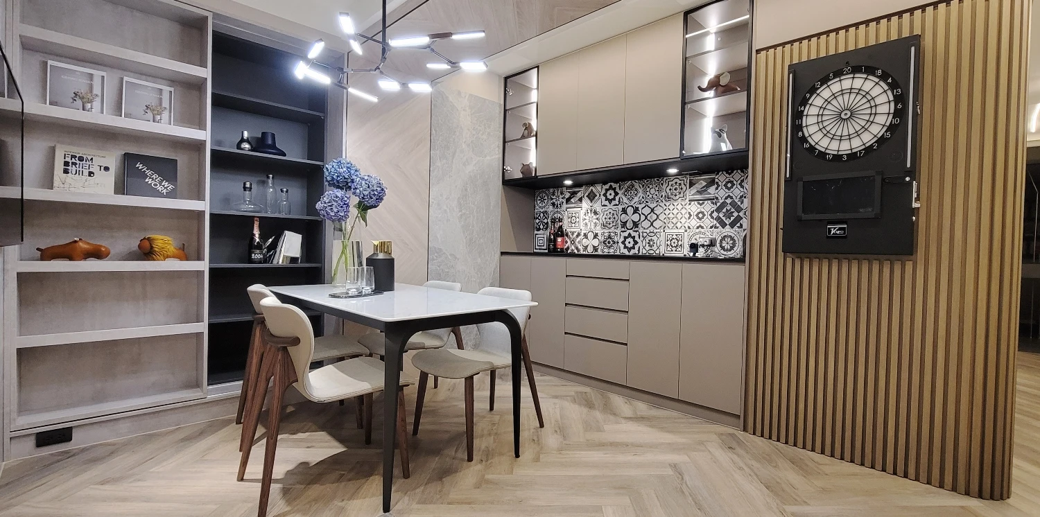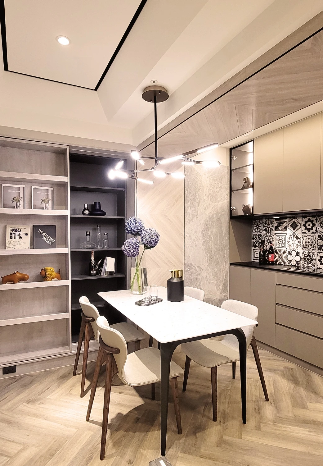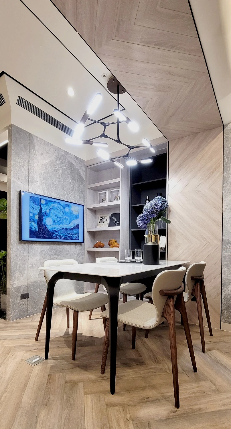 除上述精美石材,杜政坤在多元媒材的應用也毫不馬虎,替各機能場域增添俐落型格。以餐廳為例,樑上攀附科技木紋板佐人字拼變化,串聯周邊大理石電視牆佐導角無縫銜接,搭配花磚、鍍鈦不鏽鋼條,及近迎賓區的木格柵、飛鏢機等等,層層鋪墊獨樹一幟的立面表情。此外,收納、實用機能一應俱全,例如桌邊茶水餐櫃內嵌IH爐,甚或一旁矗立的移動式展示書櫃,擘劃歲月靜好的完美日常。