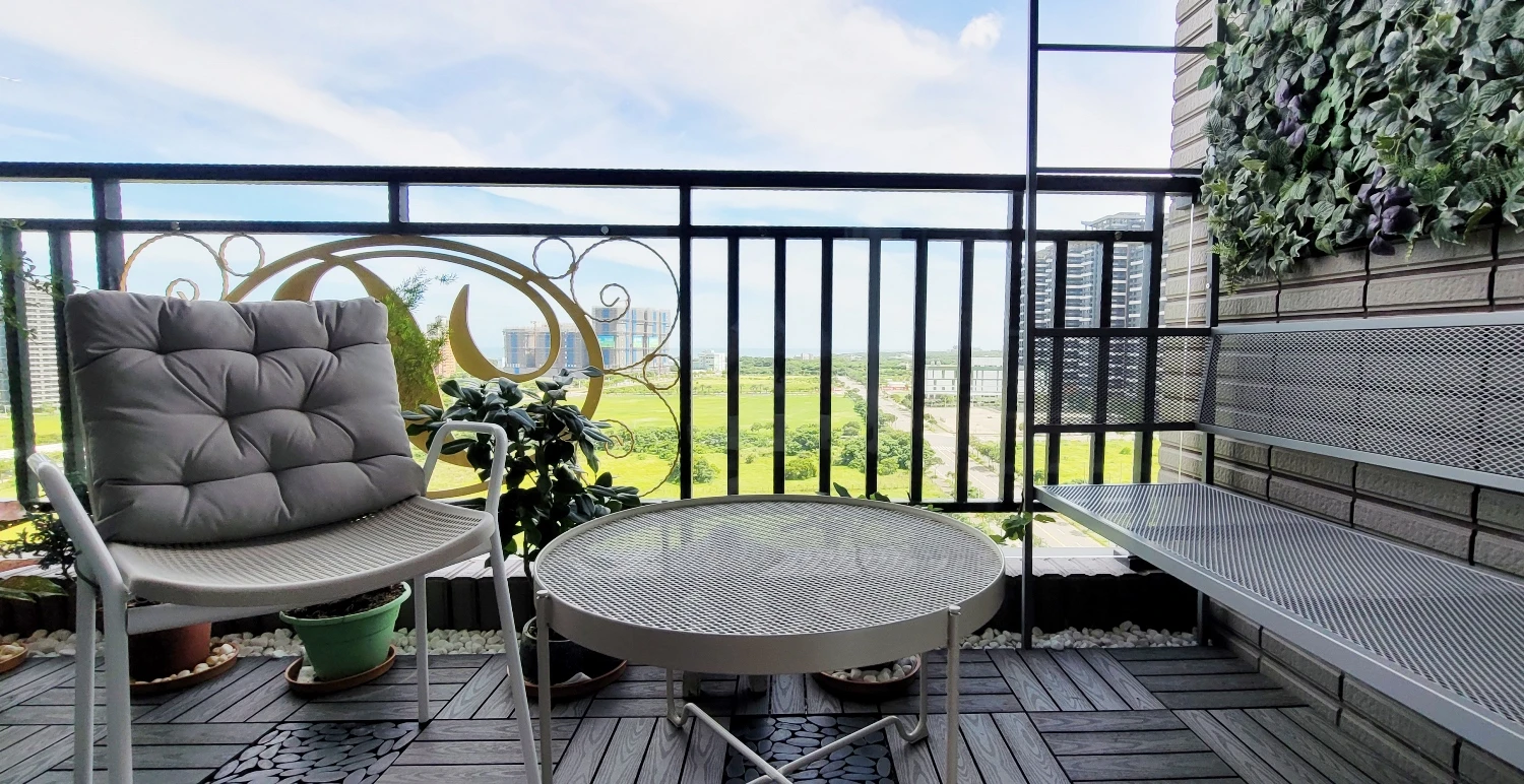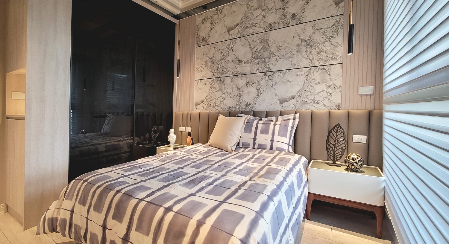 公、私領域巧妙採取鐵件玻璃屏風區隔,而廊道天花板極具未來感的流線燈設計,加上盡頭的超現實主義畫作則頗有引人入勝之況味。循藝術端景牆遁入背後的主臥房,寬敞明亮的休憩場域豁然開朗,窗外懾人美景一覽無遺;原格局的主、次臥在顧及屋主的實質需求後合而為一,附設女主人夢想的專用衣帽間。床頭收納之外,最令人津津樂道的莫過於此堪稱精品規格的更衣室,完整配備ㄇ字開放衣櫃,各式服飾配件的抽屜、吊架應有盡有;櫃體門片利用灰玻消弭視覺上的凌亂感,而上方另規劃間接照明供男主人陳列其精心收藏的公仔;鍍鈦、仿大理石地磚等元素旨在詮釋奢華,與公領域意象相互呼應。