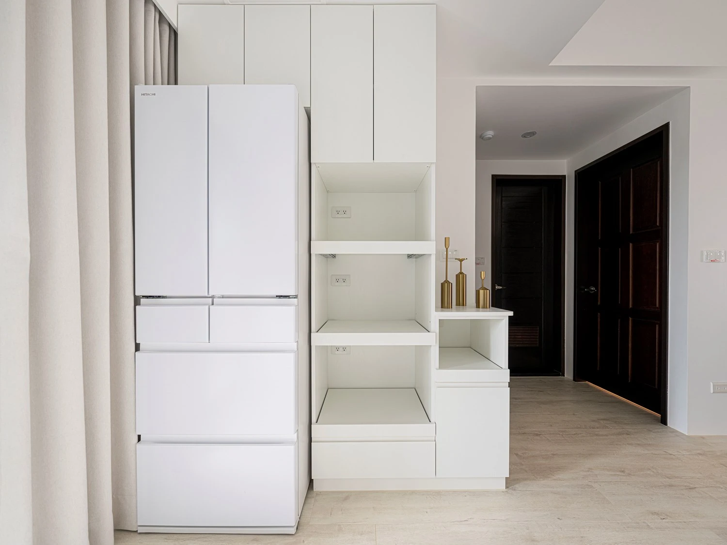 櫥櫃採無把手造型,與牆面融為一體,使畫面更俐落、活動範圍也不受限制