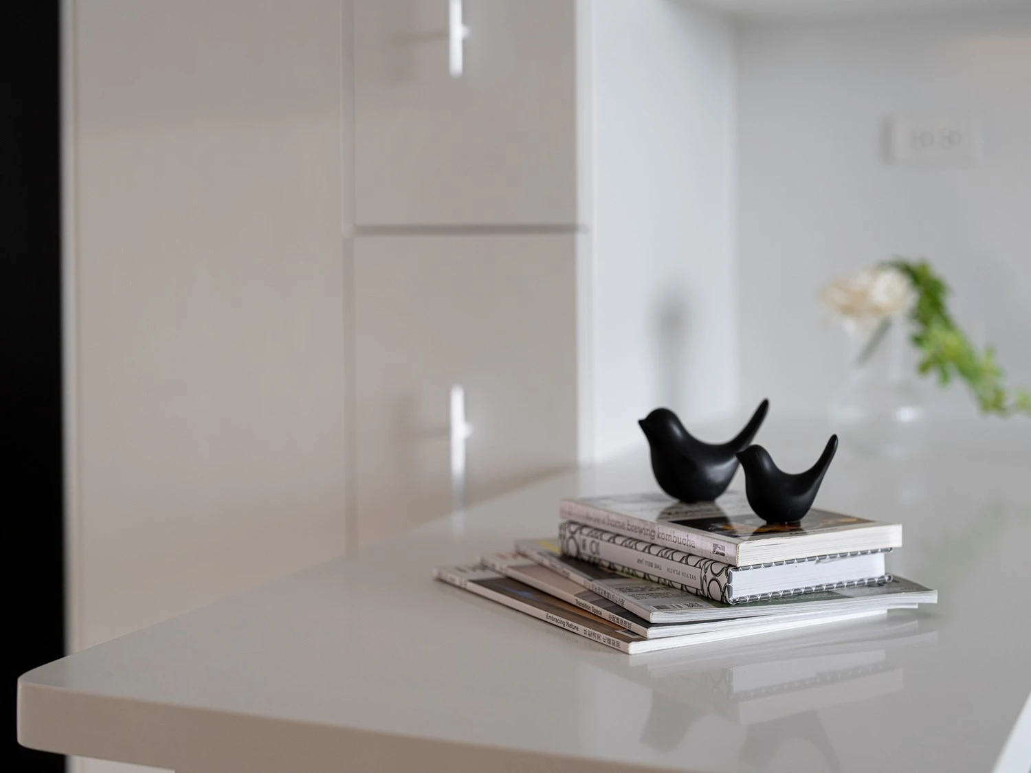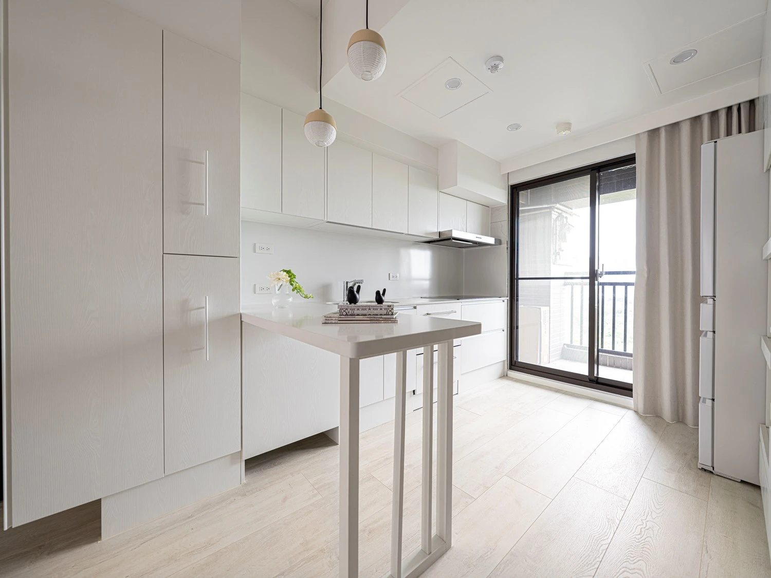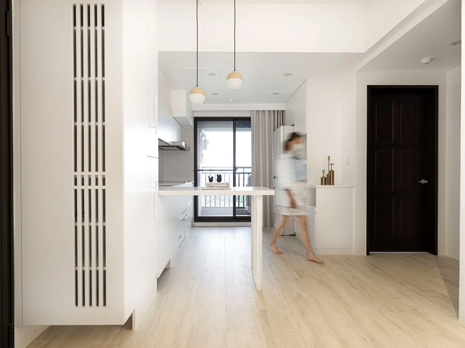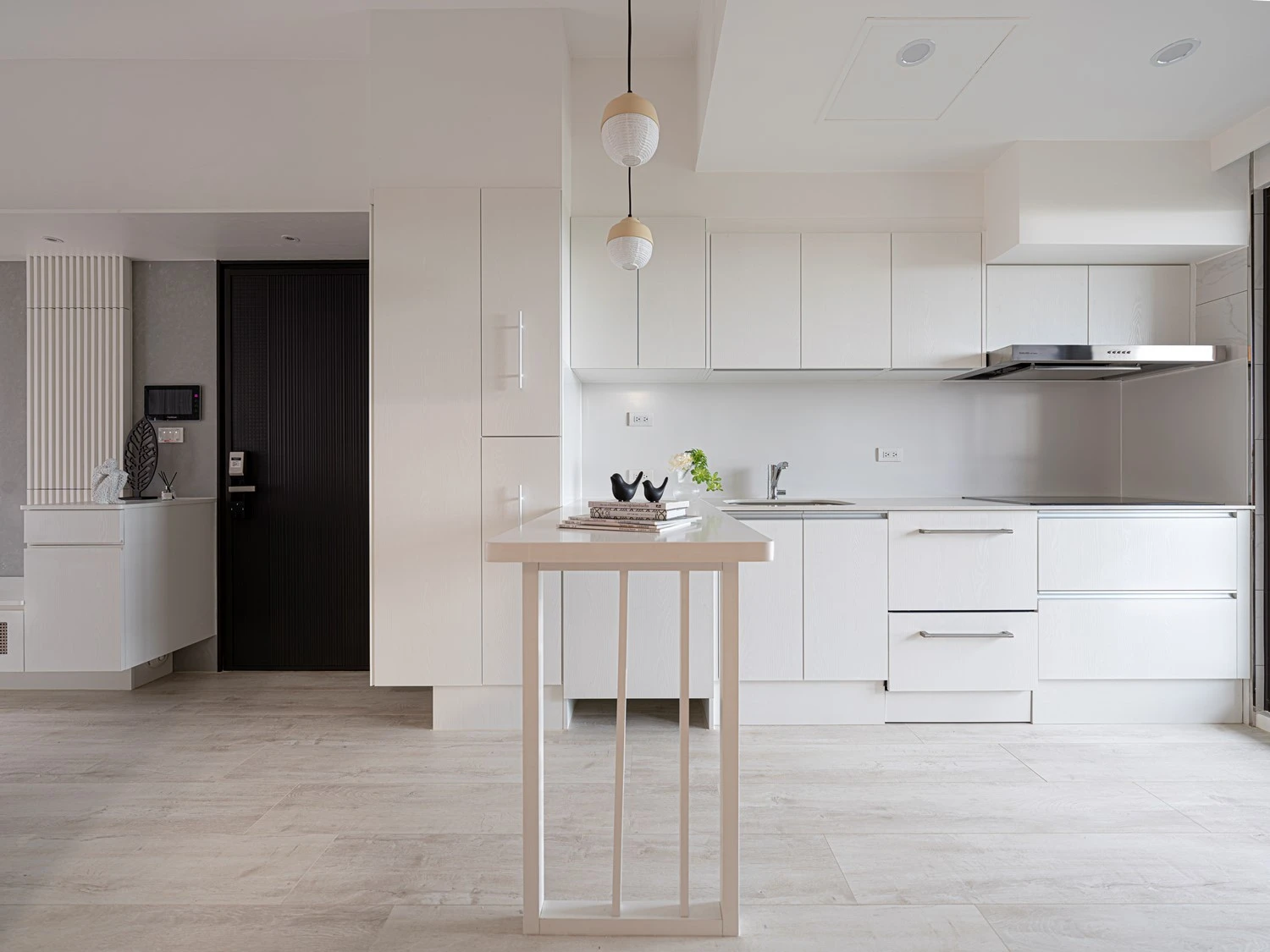 進門的左側規劃一座小型白色中島,簡單界定客餐區,同時保留寬闊動線,也兼具備餐檯或輕食區的功能