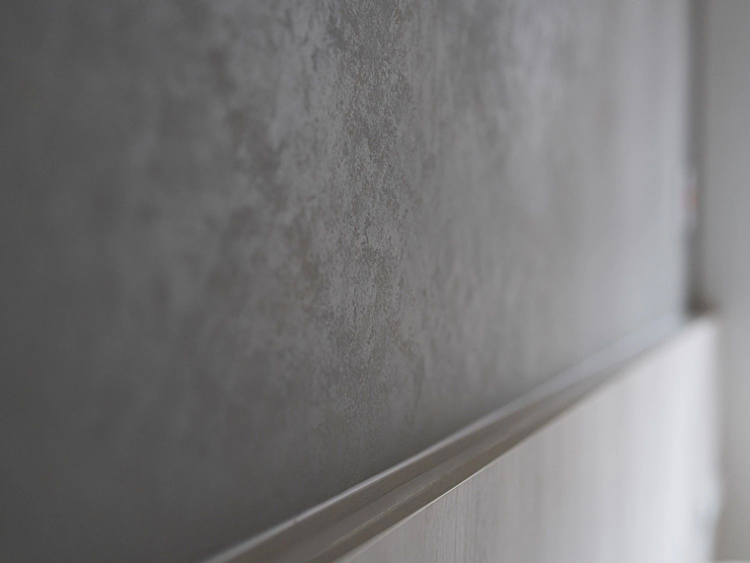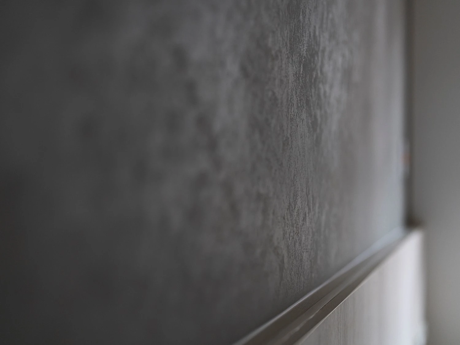 客廳背牆選用了灰色礦物藝術塗料,這種低調的中性色能凸顯周圍的家具、燈光、材質的細節層次,在白與木色之間形成視覺重心,避免空間過於單一