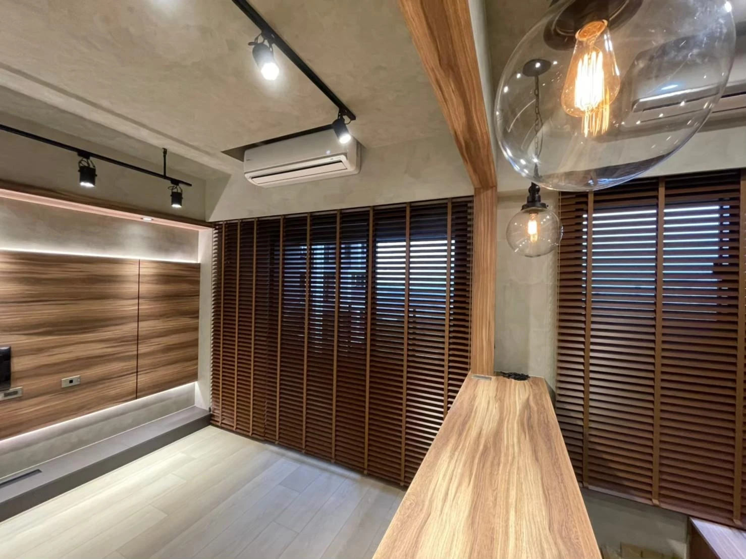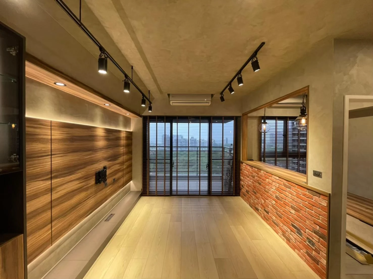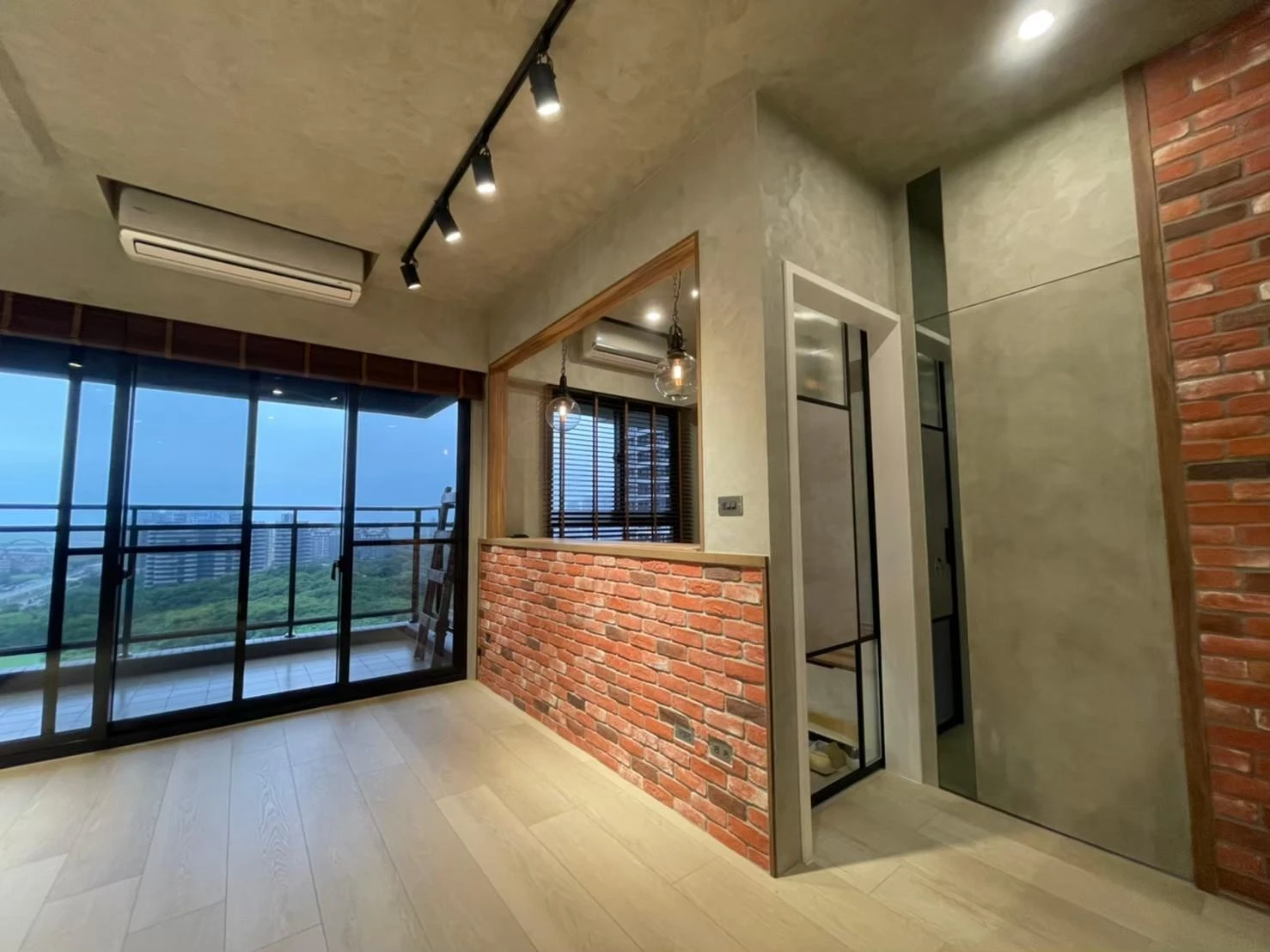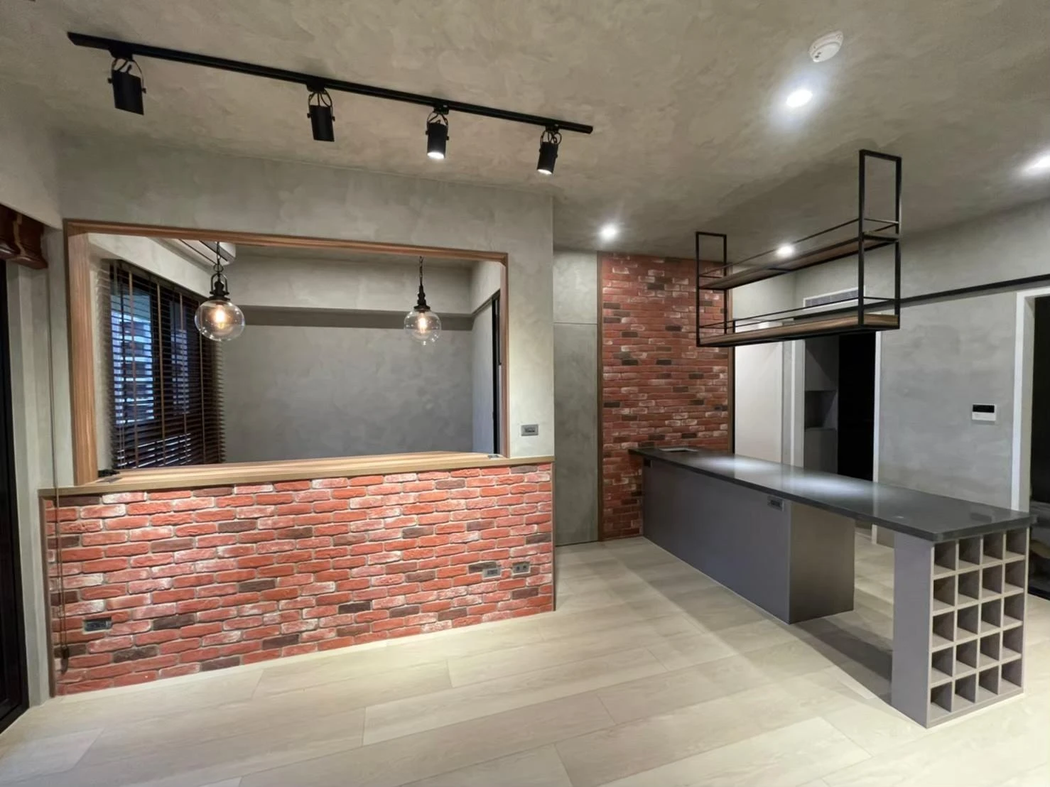 使用實木格柵、灰鏡、仿真清水模塗裝、鐵件及文化石打造獨特的重工業風格
