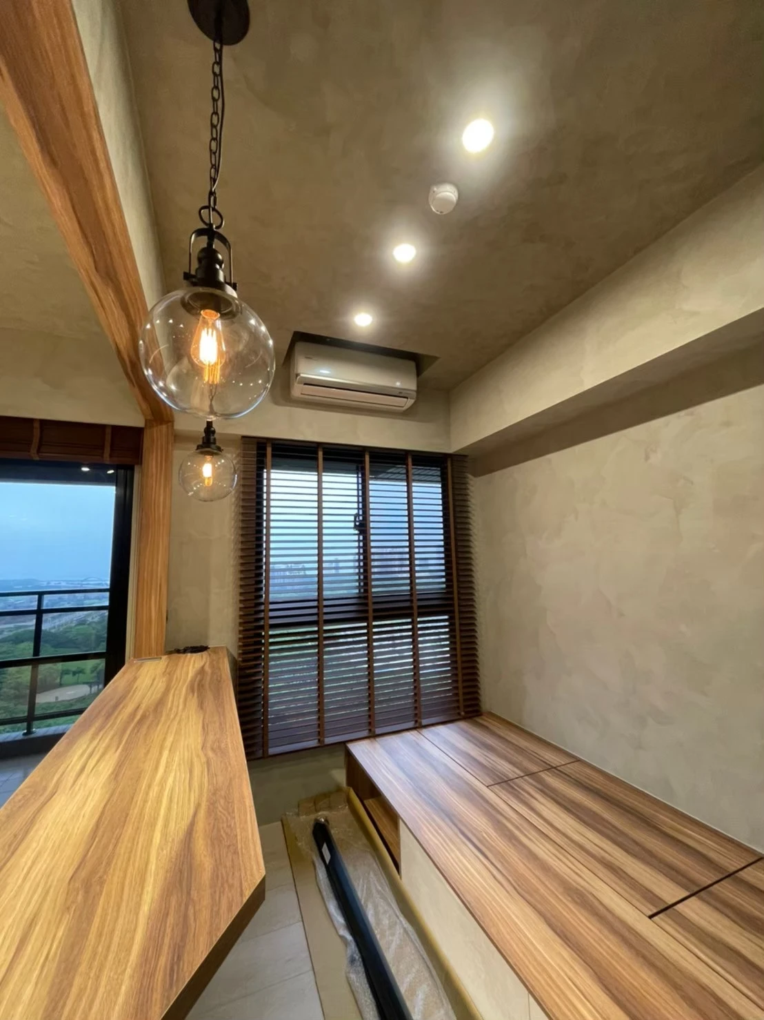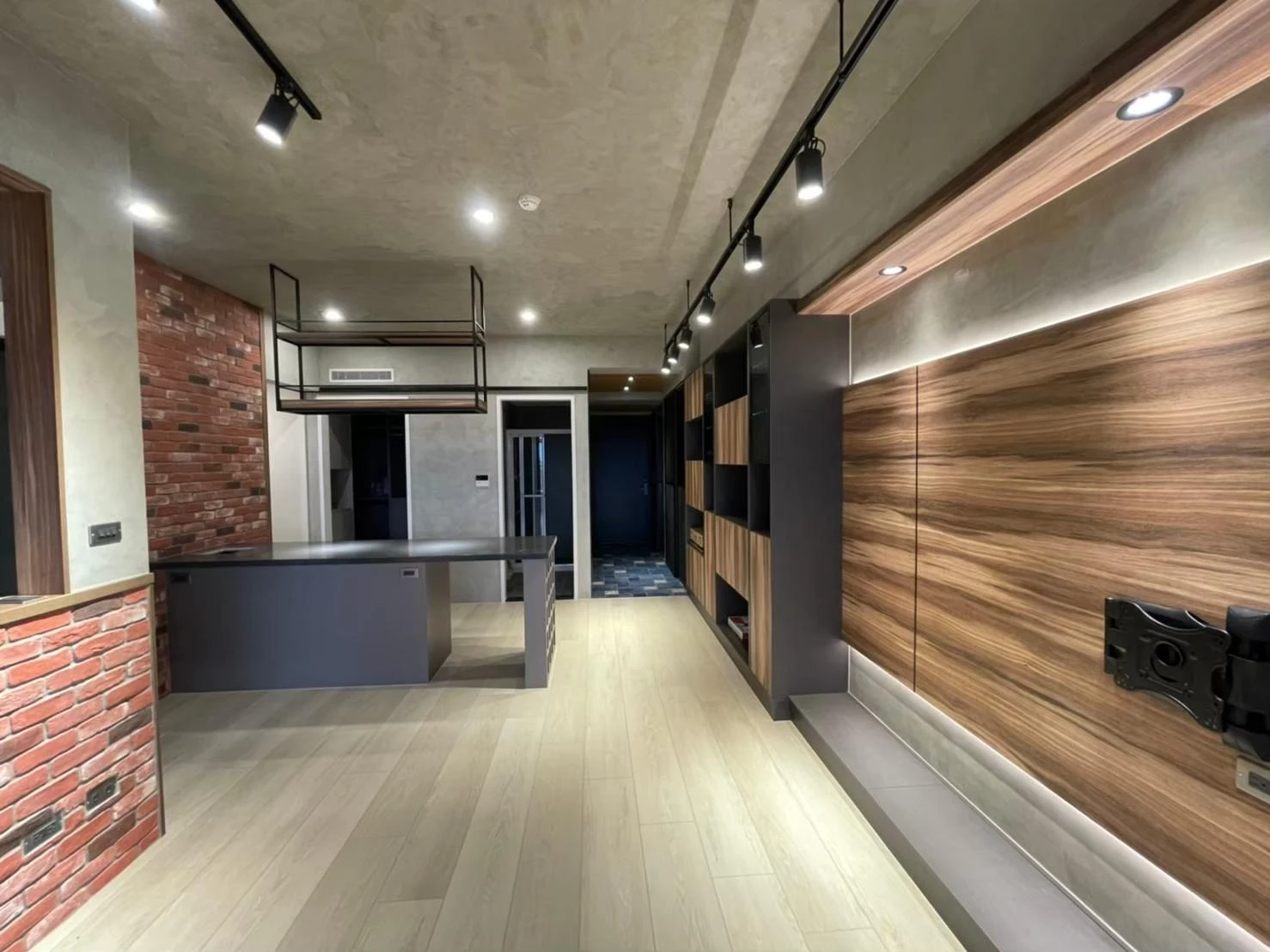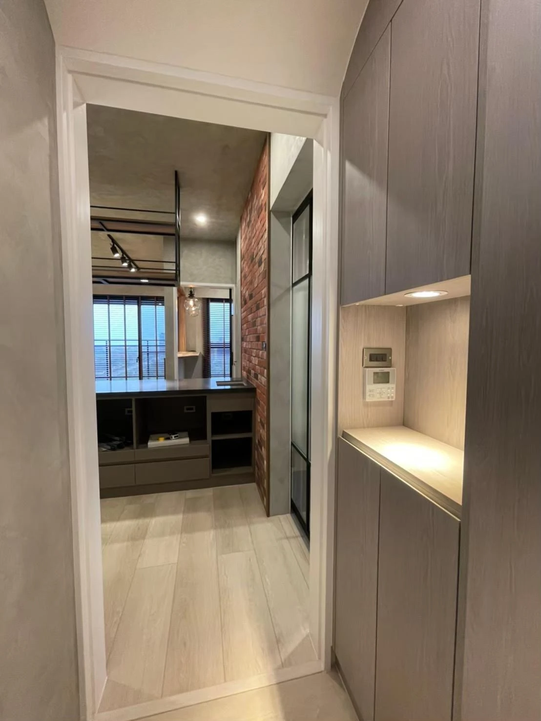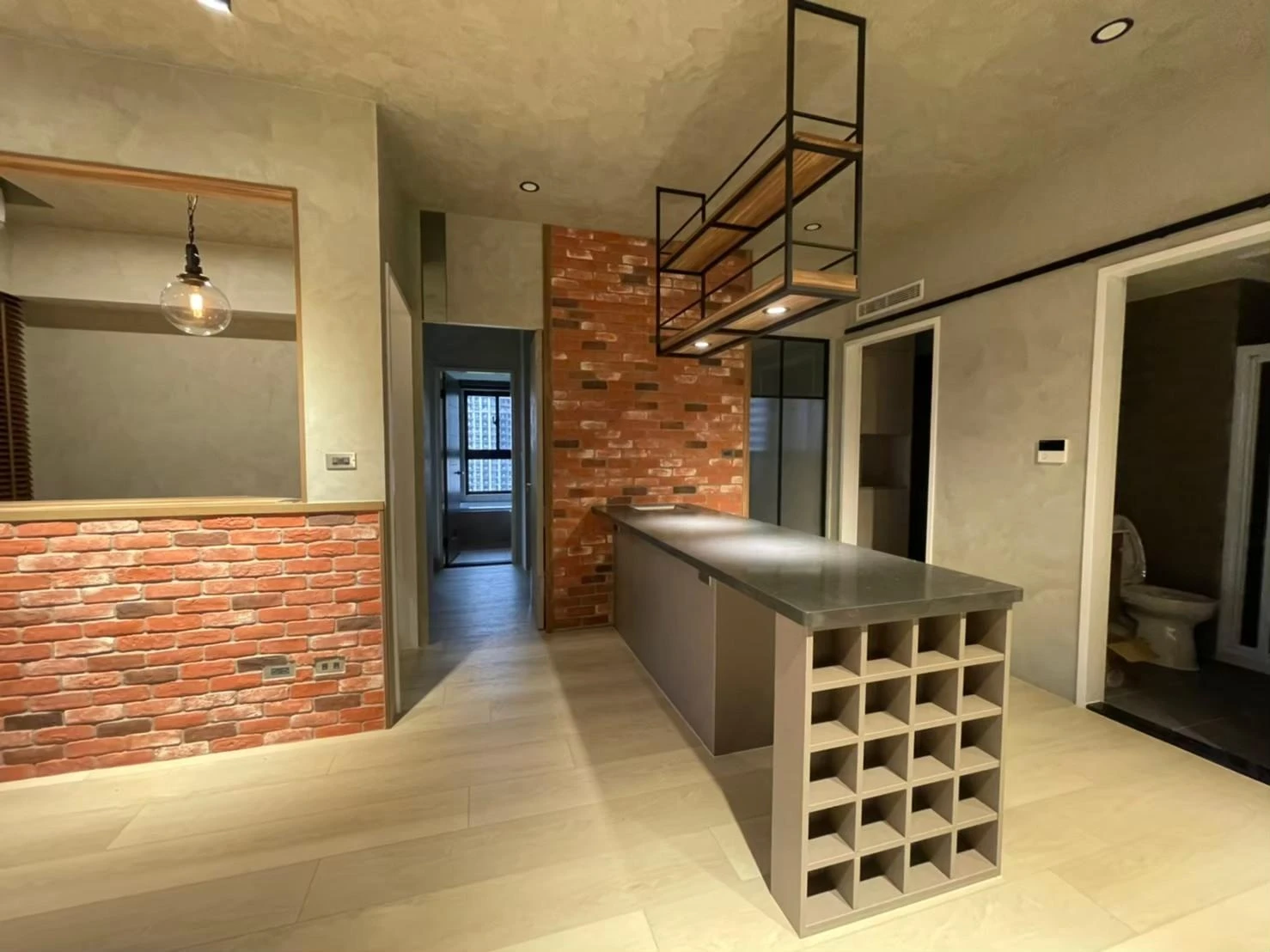 使用實木格柵、灰鏡、仿真清水模塗裝、鐵件及文化石打造獨特的重工業風格