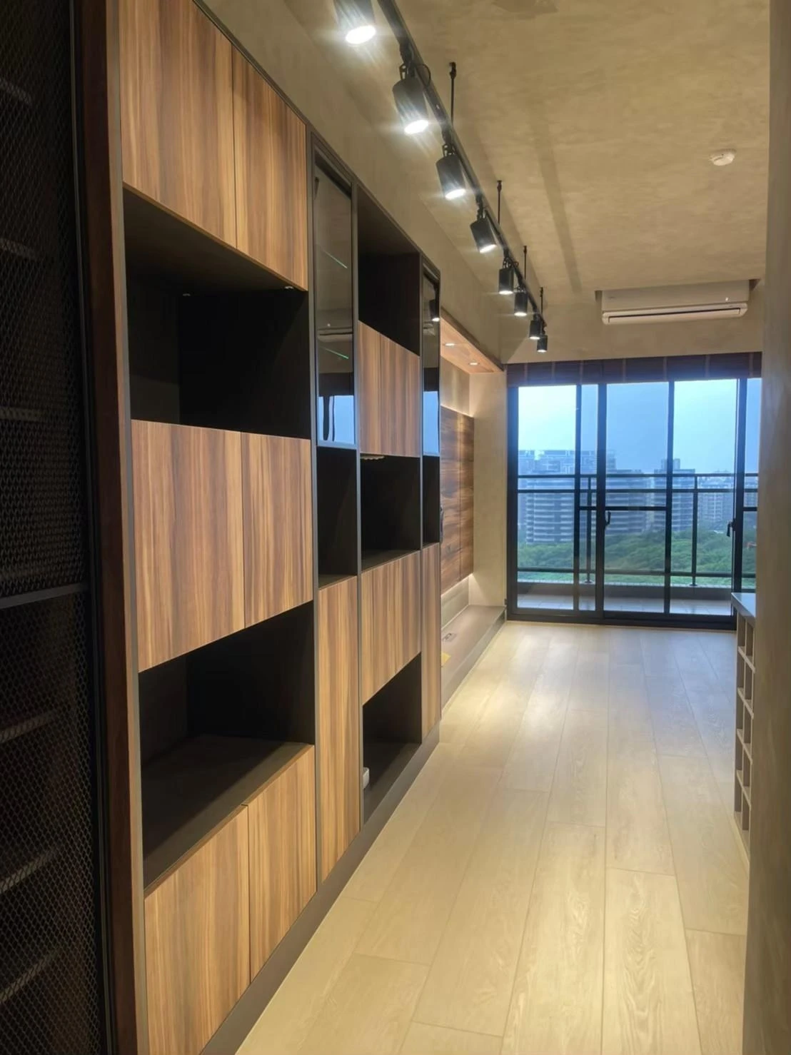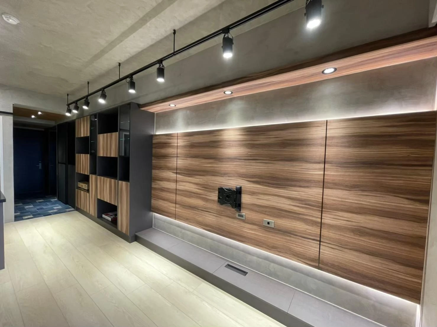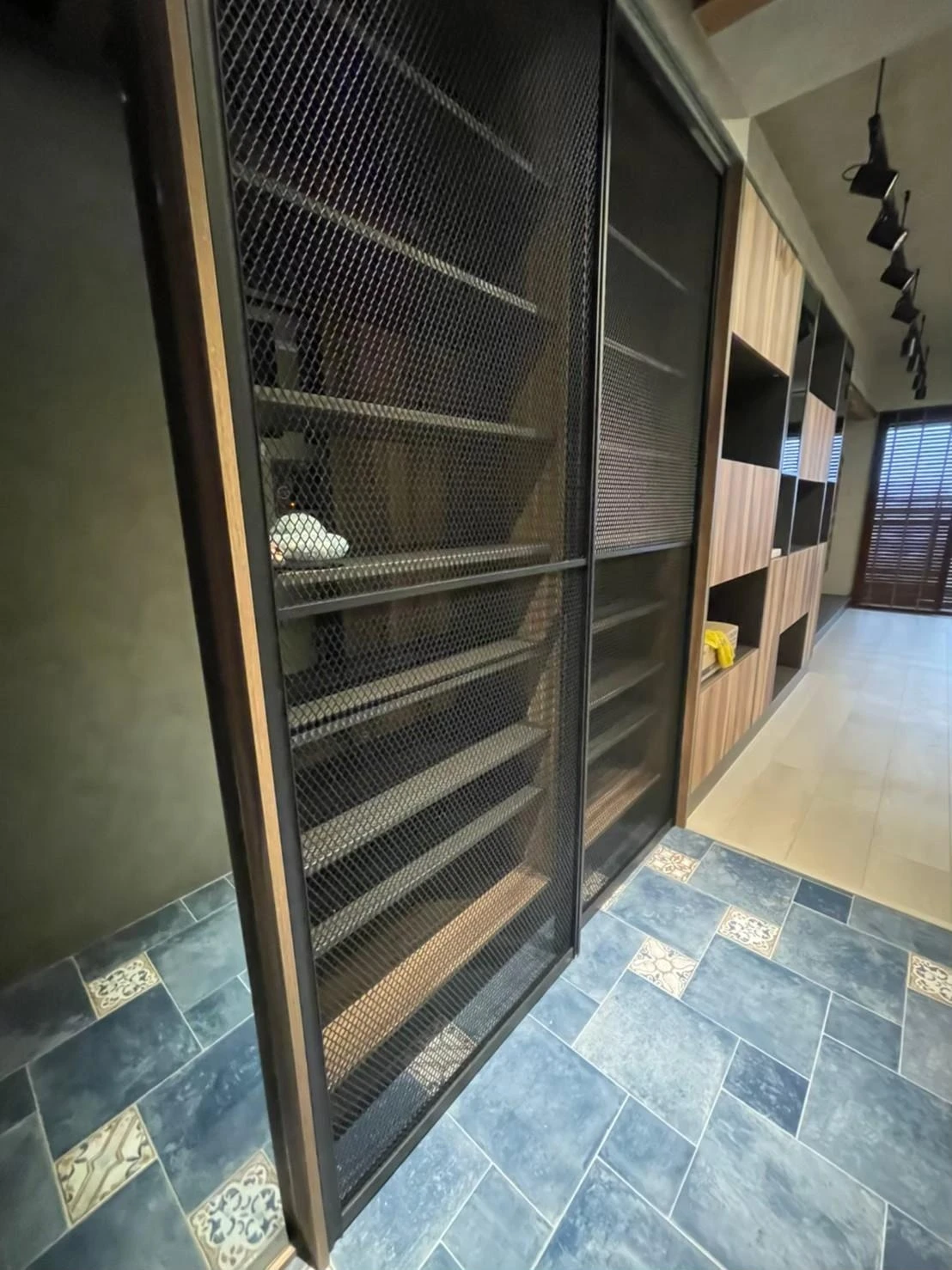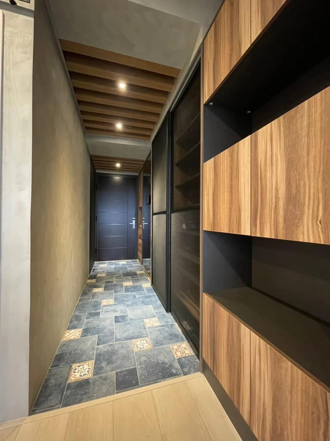 使用實木格柵、灰鏡、仿真清水模塗裝、鐵件及文化石打造獨特的重工業風格