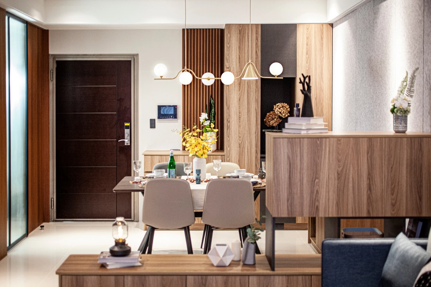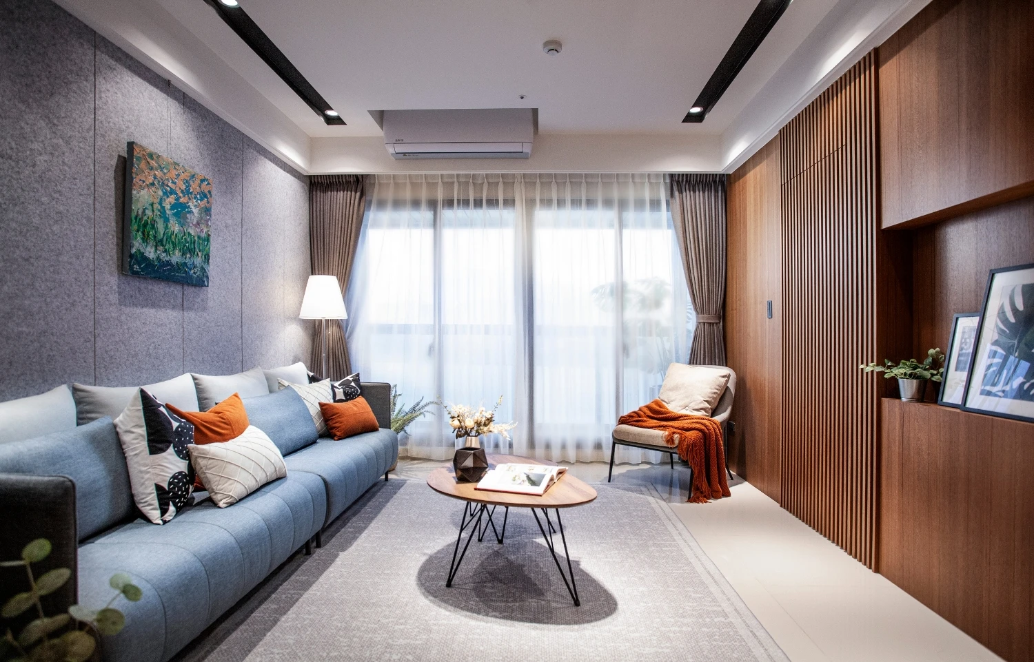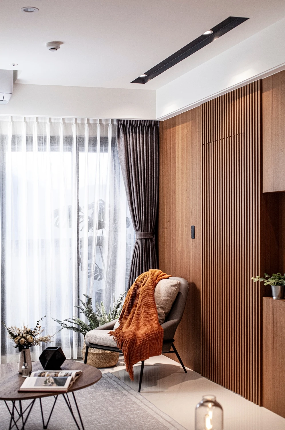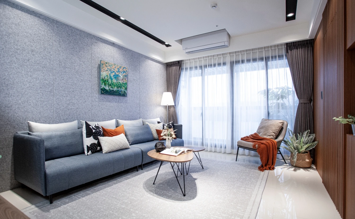 以「與海為鄰的悠然」做發想,透過建築本身格局的限制,將落地窗與建築樓高的優勢結合,自然的將海景引進室內空間,營造出和諧且光線自然的色調;同時為了增添自然光所帶來的灰冷感,設計了實木格柵,巧妙整合了三個門並將其隱藏,這設計方案不僅增強了客廳和用餐區之間的流動性同時又讓私密空間更具隱匿性。