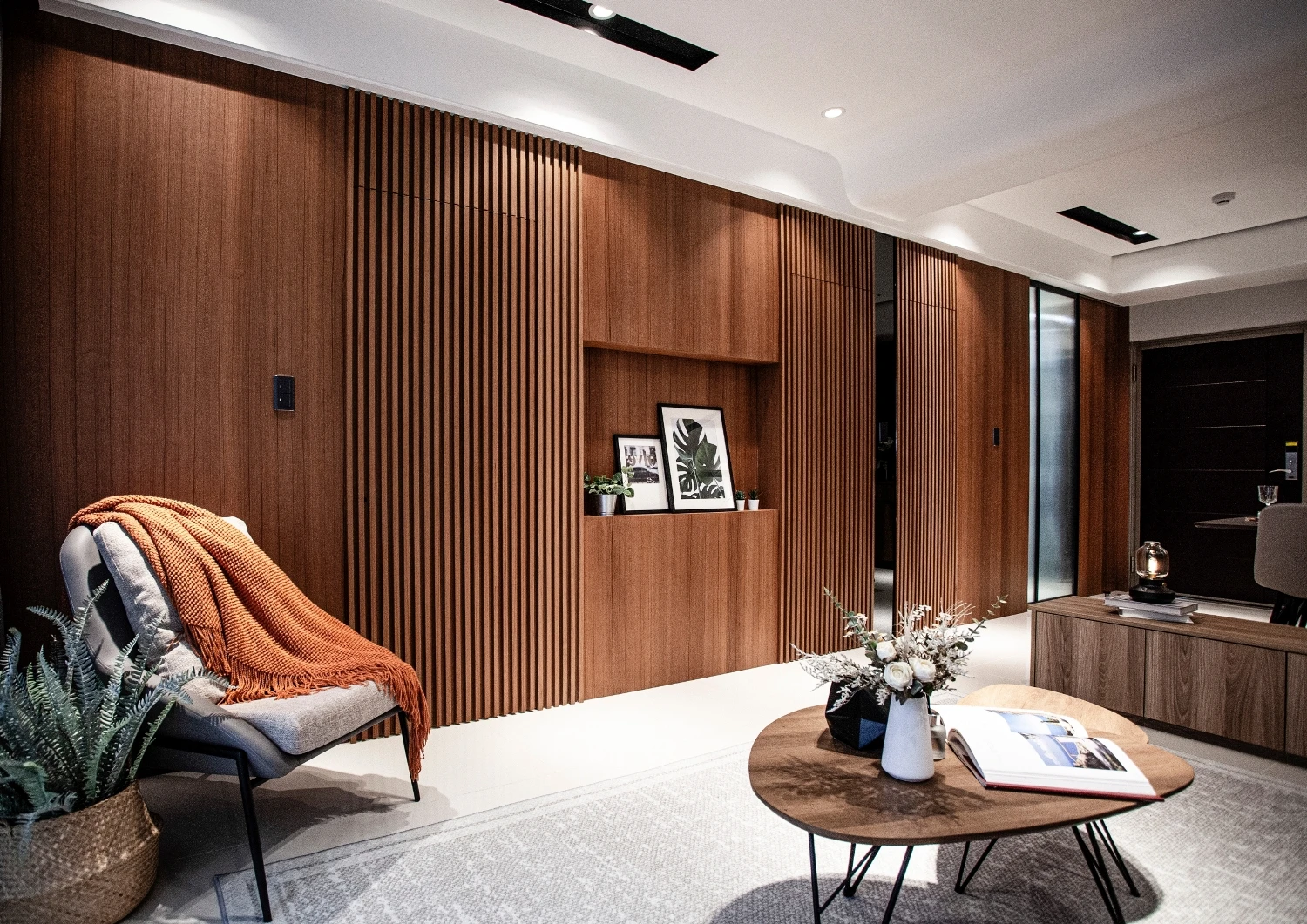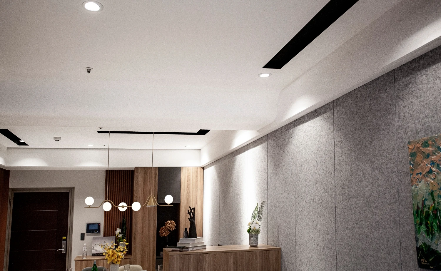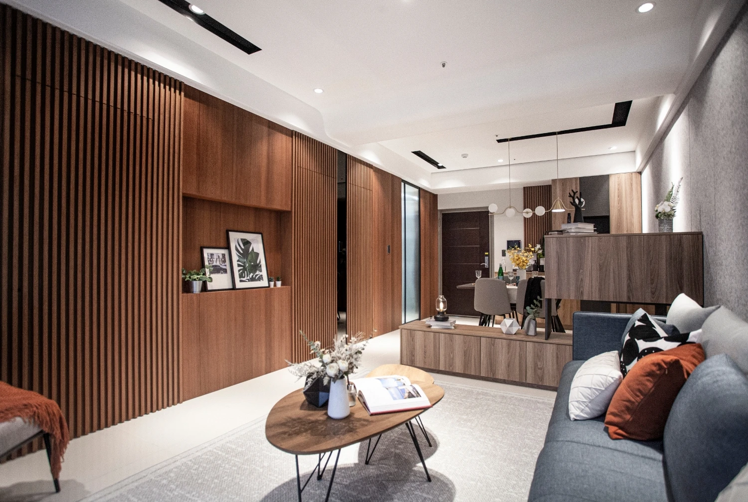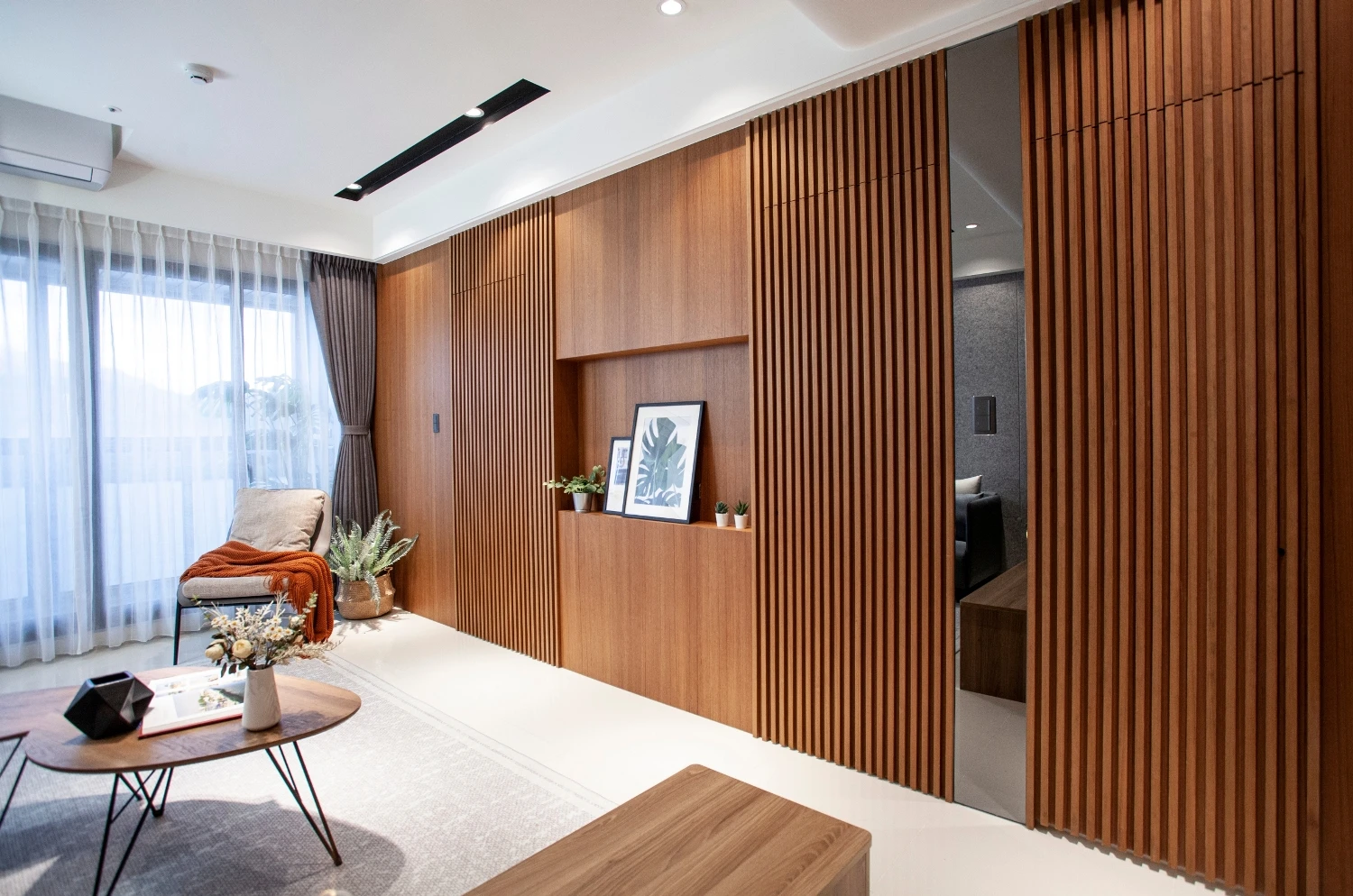 以「與海為鄰的悠然」做發想,透過建築本身格局的限制,將落地窗與建築樓高的優勢結合,自然的將海景引進室內空間,營造出和諧且光線自然的色調;同時為了增添自然光所帶來的灰冷感,設計了實木格柵,巧妙整合了三個門並將其隱藏,這設計方案不僅增強了客廳和用餐區之間的流動性同時又讓私密空間更具隱匿性。