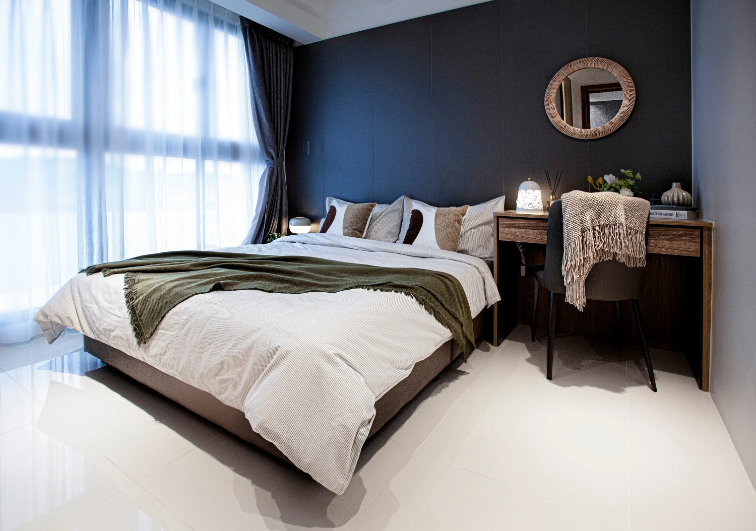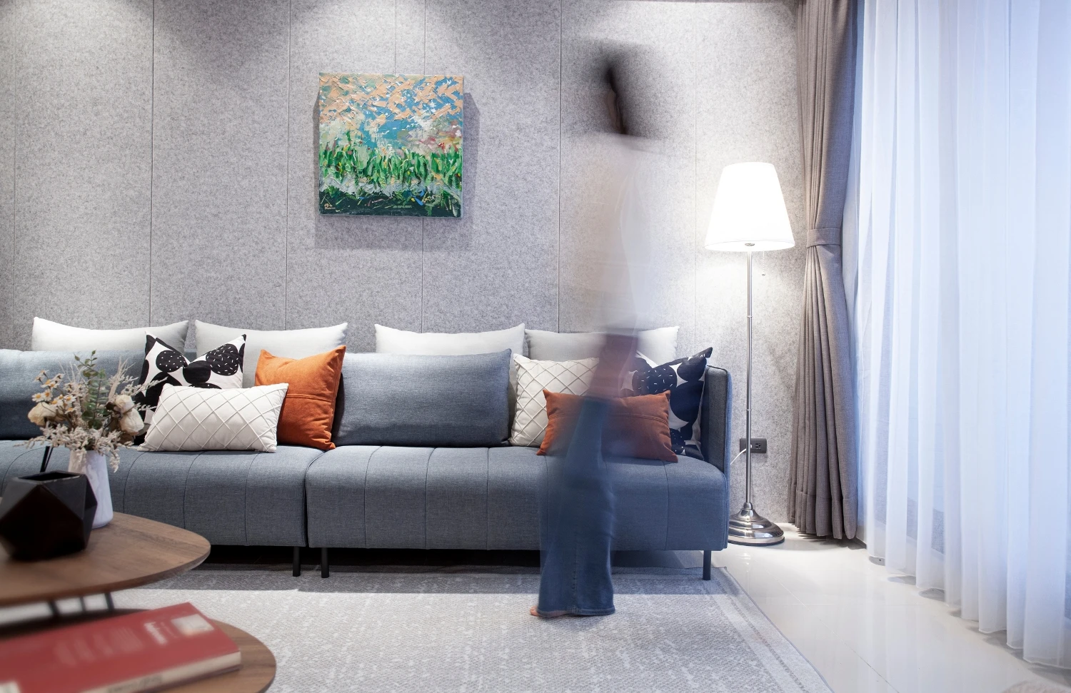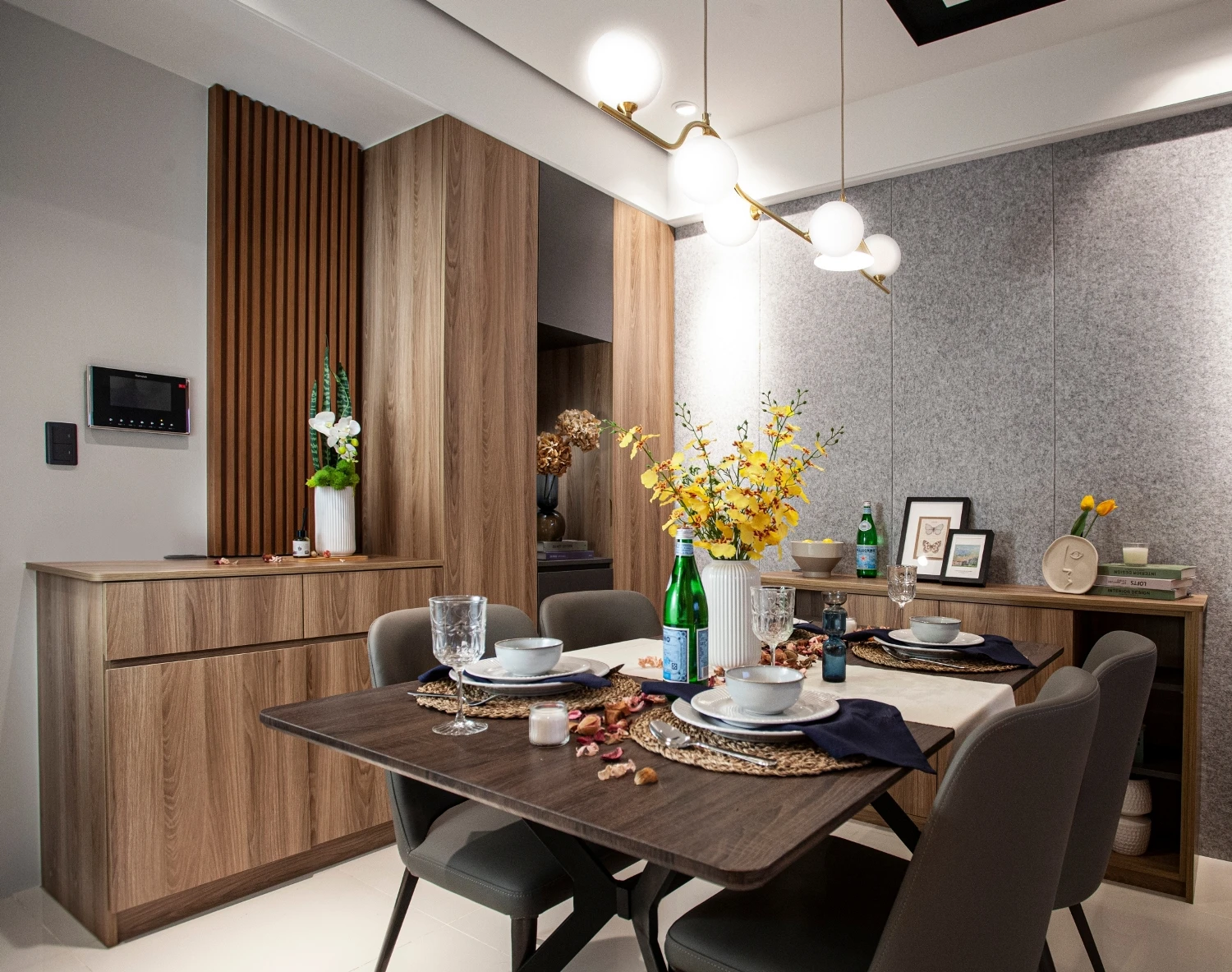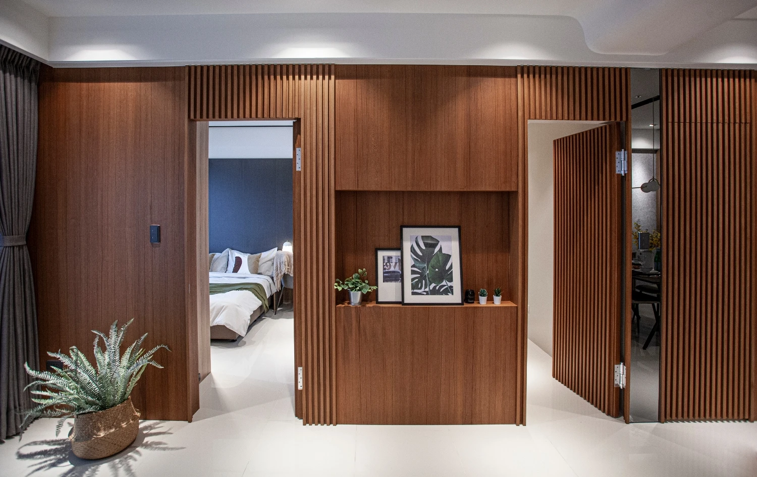 以「與海為鄰的悠然」做發想,透過建築本身格局的限制,將落地窗與建築樓高的優勢結合,自然的將海景引進室內空間,營造出和諧且光線自然的色調;同時為了增添自然光所帶來的灰冷感,設計了實木格柵,巧妙整合了三個門並將其隱藏,這設計方案不僅增強了客廳和用餐區之間的流動性同時又讓私密空間更具隱匿性。