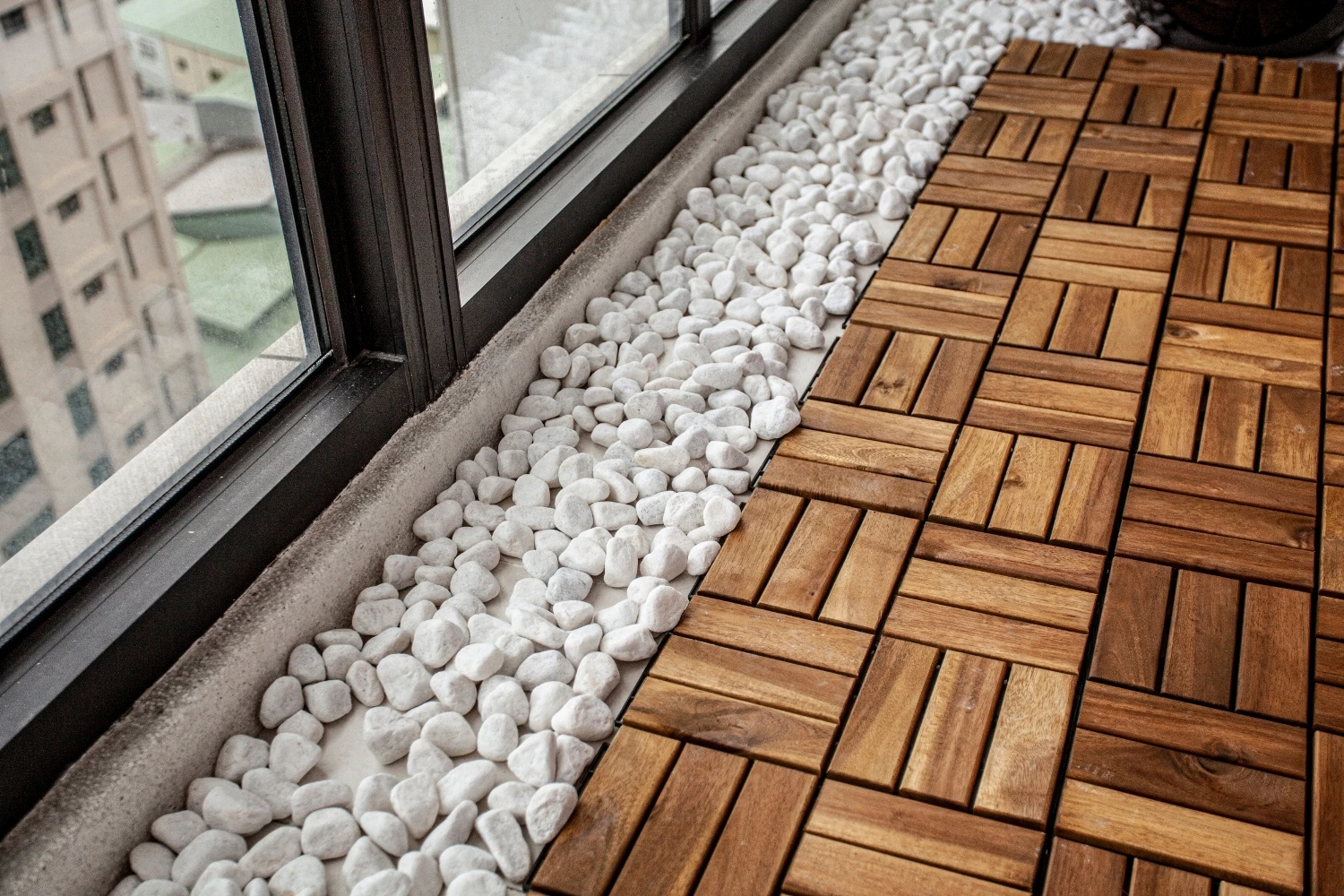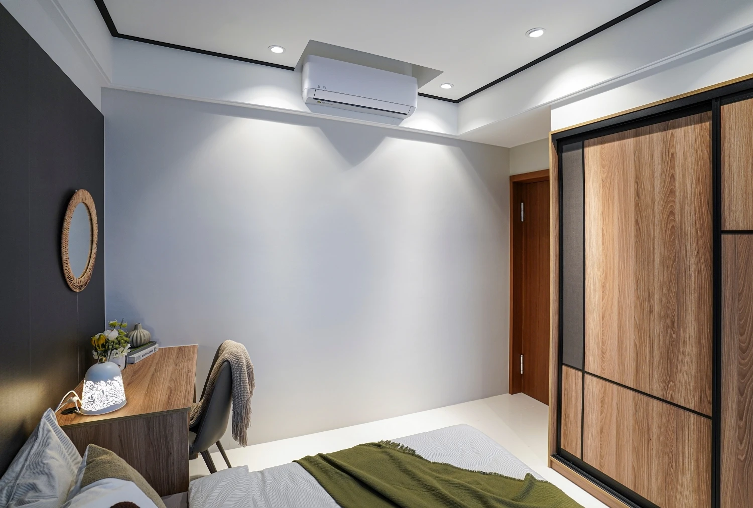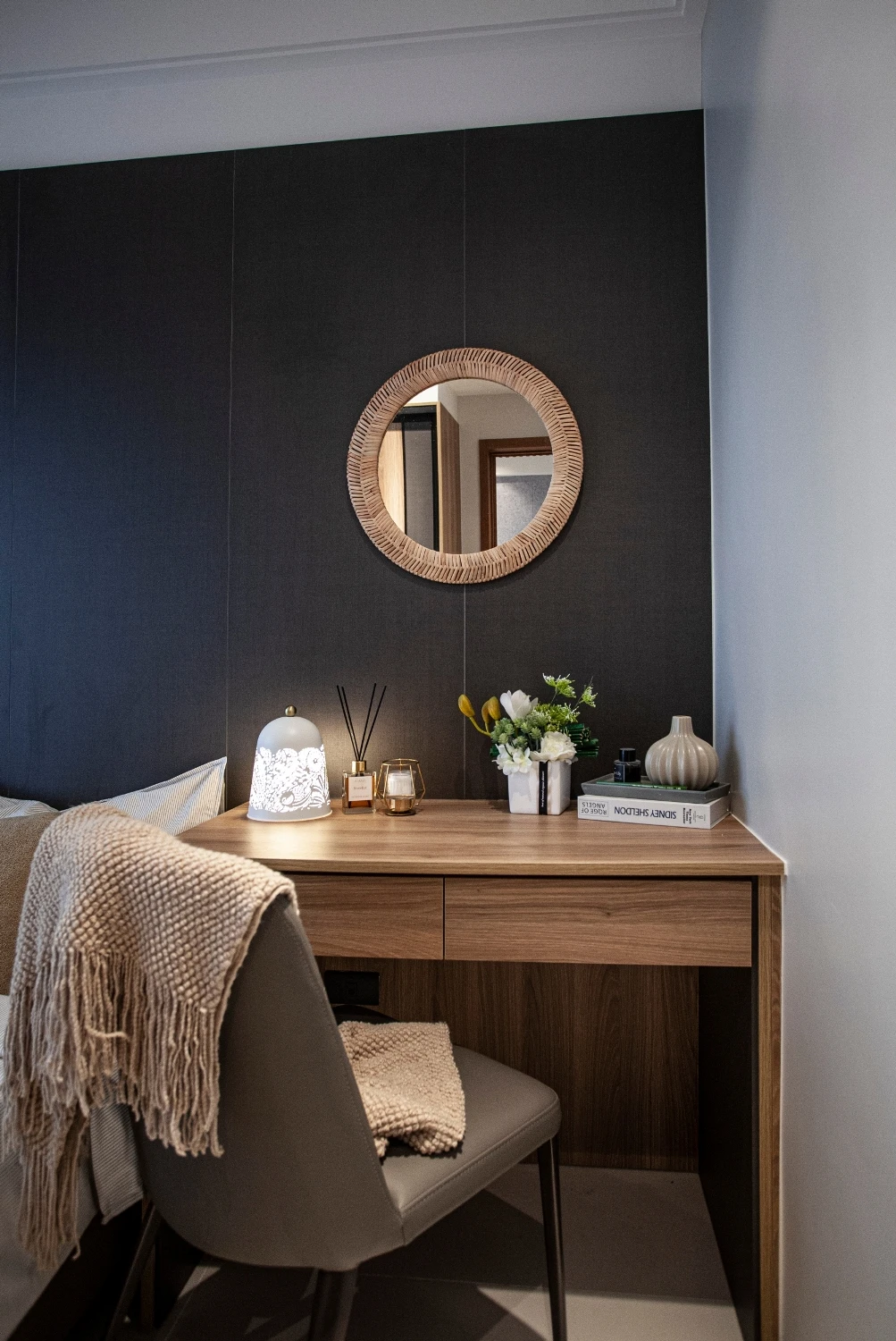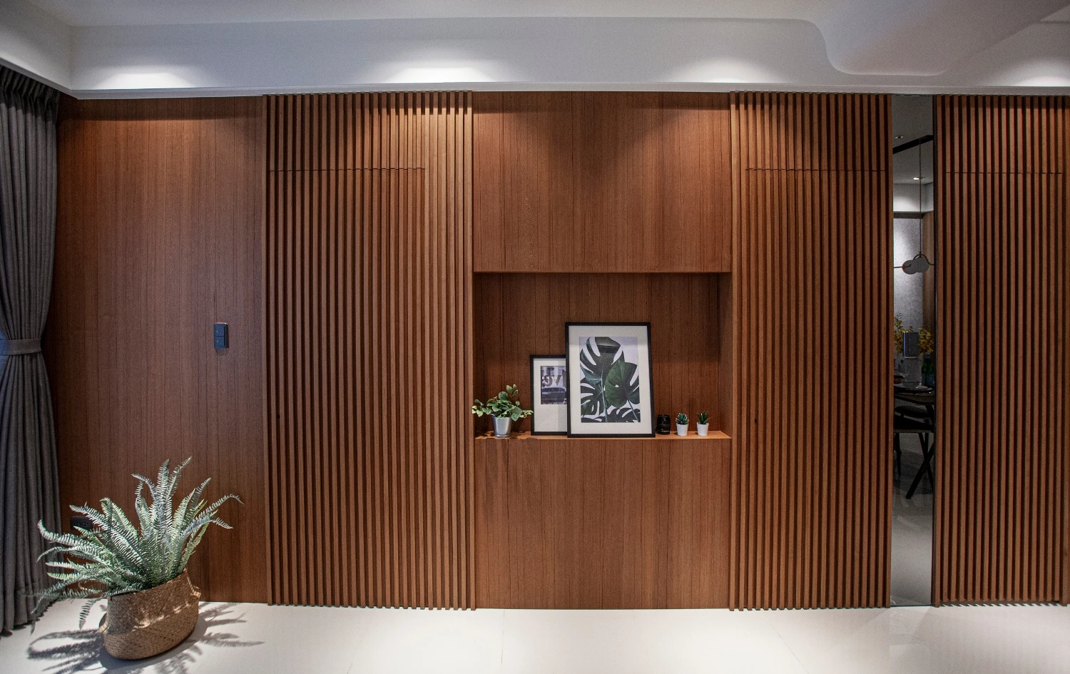 以「與海為鄰的悠然」做發想,透過建築本身格局的限制,將落地窗與建築樓高的優勢結合,自然的將海景引進室內空間,營造出和諧且光線自然的色調;同時為了增添自然光所帶來的灰冷感,設計了實木格柵,巧妙整合了三個門並將其隱藏,這設計方案不僅增強了客廳和用餐區之間的流動性同時又讓私密空間更具隱匿性。
